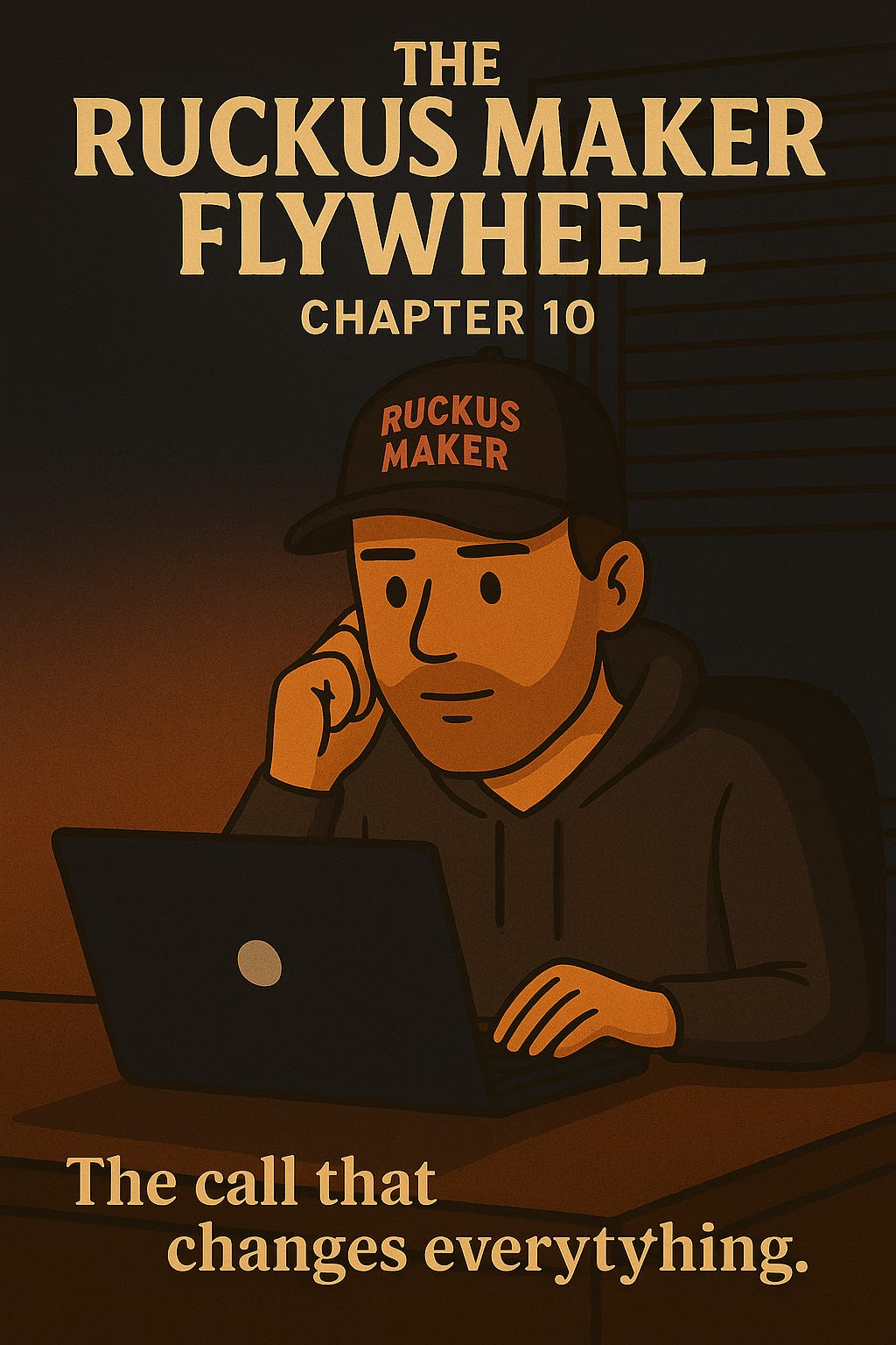 RUCKUS MAKER hat. Hoodie. Whiteboard behind him, but no slides, no script. Just him. Present. Sharp-eyed. At ease.