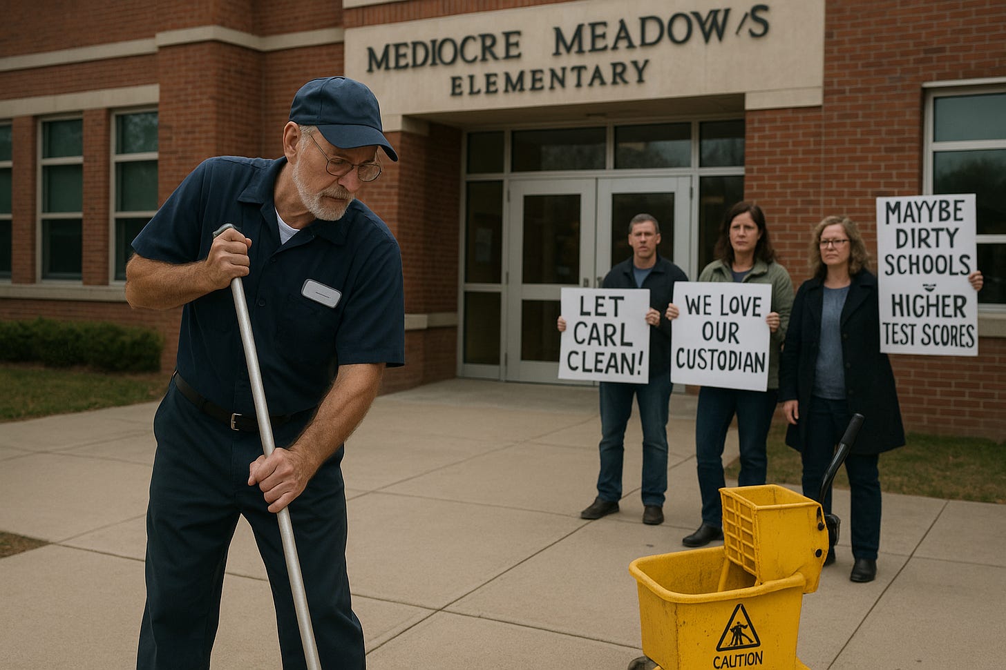 Cactus Bluff, AZ — In a move that has stunned teachers, parents, and even the pigeons that nest in the cafeteria vents, Principal Linda Dabble of Mediocre Meadows Elementary is pushing to fire long-time custodian Carl “Sparkle” Simmons—despite his flawless record of receiving perfect 100s on district cleanliness audits.
